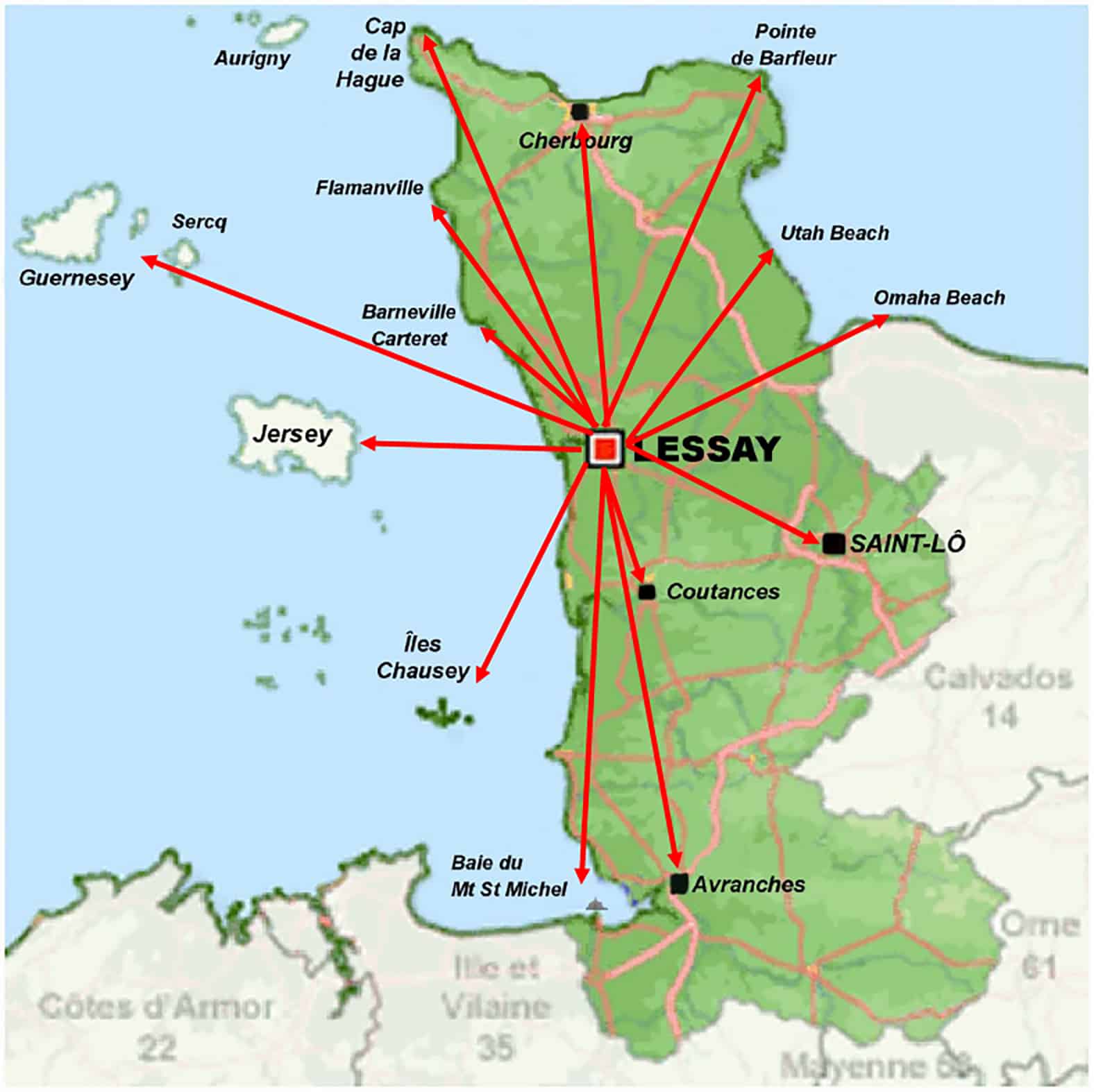 Mer incroyablement transparente et turquoise, de nombreux parcs à moules et huîtres, la Baie du Mont-Saint-Michel au sud, Utah Beach à l’est, côte bretonne à l’ouest avec la côte d’Armor.